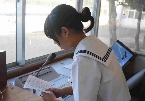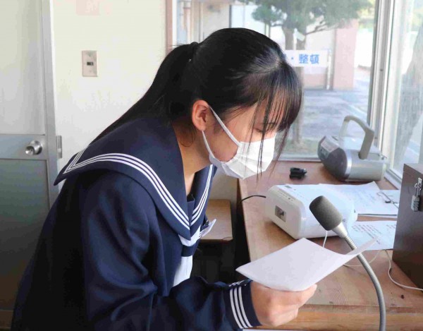 10月10日(金)に、「尾道市中学校第72回駅伝競走大会」の壮行式を放送により行いました。生徒会執行部からの激励の言葉のあと、3年生の代表が、「今まで練習してきた成果を生かして、精一杯たすきをつなぎます」と力強い決意表明を行いました。