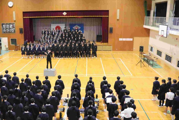 続いて、中学3年生が、合唱2曲披露し、小中学生がいっしょに「ふるさと」を合唱しました。各小学校の6年生が、それぞれふり返りを発表し、中学3年生の代表が挨拶をし、会を締めくくりました。