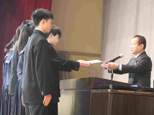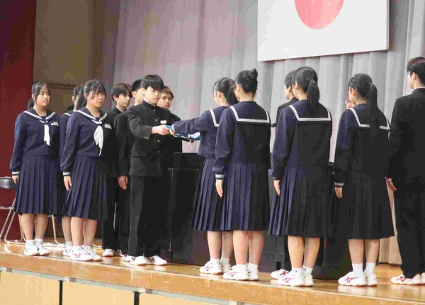 最初に校長先生から、新役員を代表して、新会長に「認証状」が手渡されました。次に、生徒会長から、この1年間の振り返りと激励のことばが述べられました。続いて、新生徒会長より、生徒会役員、3年生に対する感謝の言葉と決意の言葉が述べられました。生徒会長から新生徒会長に「生徒会旗」が引き継がれ、校長先生より感謝と激励の言葉がありました。