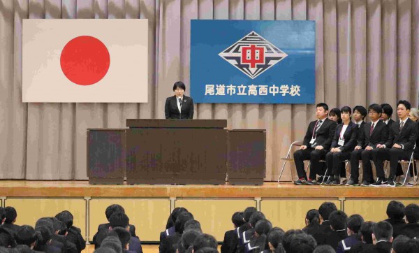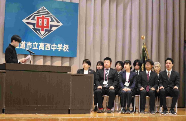 4月6日(月)校庭の桜が満開の中、令和8年度 就任式を行いました。新たに9名の先生方をお迎えして、今年度の新たなるスタートを切りました。校長先生の就任者紹介の後、生徒会代表が「歓迎の言葉」を述べました。「静まるときは整然と はじけるときは思い切り」を合言葉に取り組んできた高西中学校の紹介と先生方を歓迎する思いが述べられました。新しく来られた先生方からご指導いただき、「チーム高」として、さらに誇れる学校にしていきましょう。