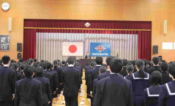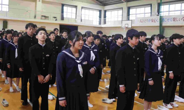4月6日(月)第1学期 始業式を行いました。式辞の中で吉用校長先生は次のように述べられました。「生徒のみなさん、進級おめでとう。昨年度の修了式で、皆さんに『成長に終わりはない。小さなことを毎日積み上げることが大切だ。人の見ていない時間をどう使うかがカギとなる』ことを伝えました。特に3年生は、自分のためだけでなく、まわりにどのような影響を与えるかをしっかり考えて行動してほしいです。今年度の重点項目は『あいさつ』です。あいさつは誰にでもできるコミュニケーションの第一歩です。あいさつがお互いにできる集団は、安心して生活できる集団です。「静まるときには整然と はじけるときは思い切り」は、安心、安全な集団であってこそ実現できます。今年度もがんばっていきましょう。」