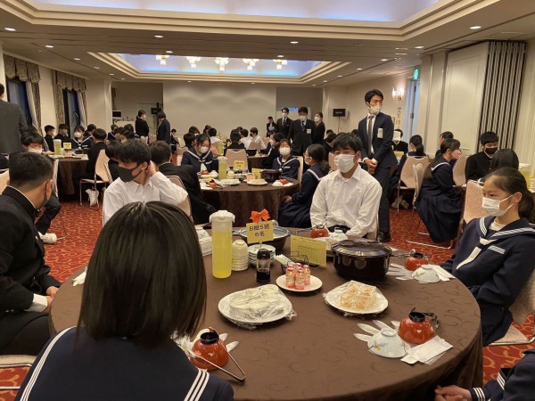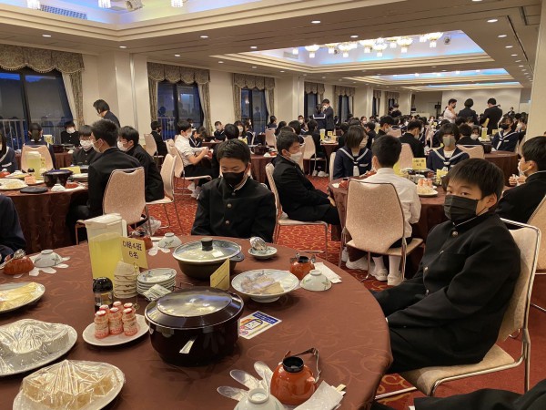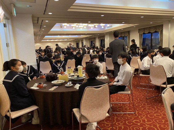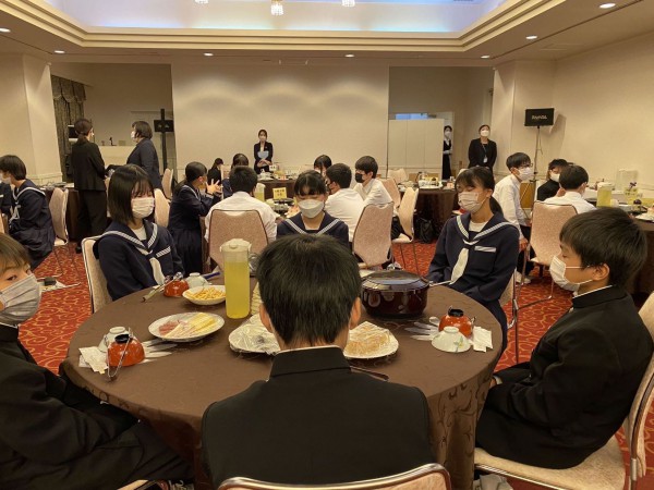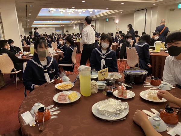 <<戻る 修学旅行団3日目〜朝食会場から〜 令和4年10月27日(木) いよいよ、修学旅行最終日となりました。天気は、曇りです。 生徒たちは、今日も眠そうですが、全員元気です。 しっかり食べて、今日の活動に備えます。 <<戻る